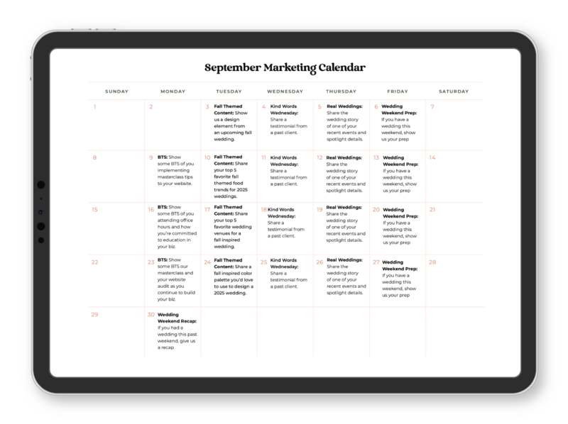 Never worry about what to post again. Our monthly marketing guide is filled with curated ideas and strategic tips to help you engage high-end clients.